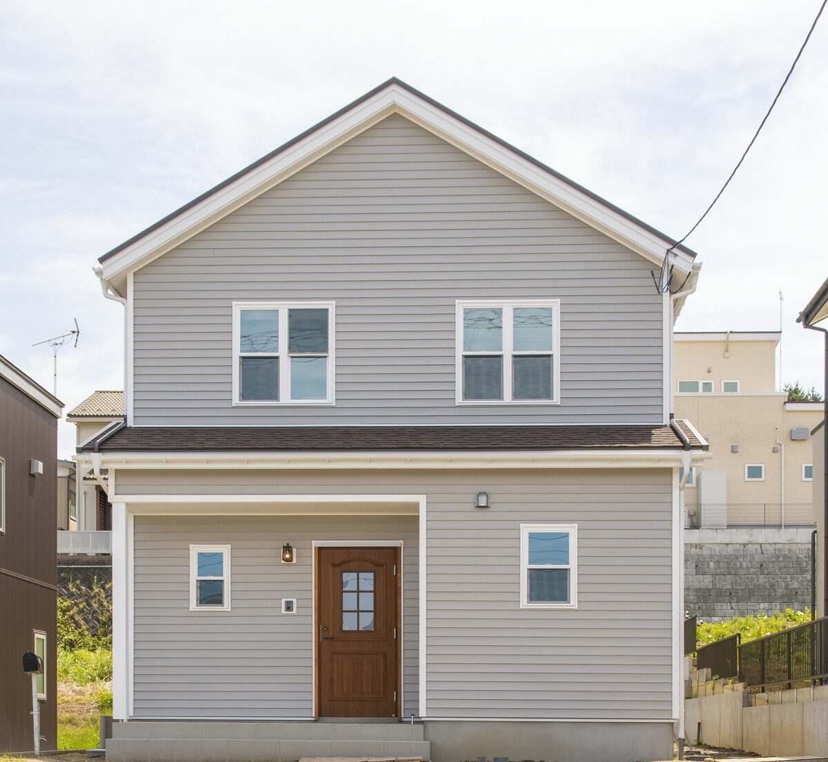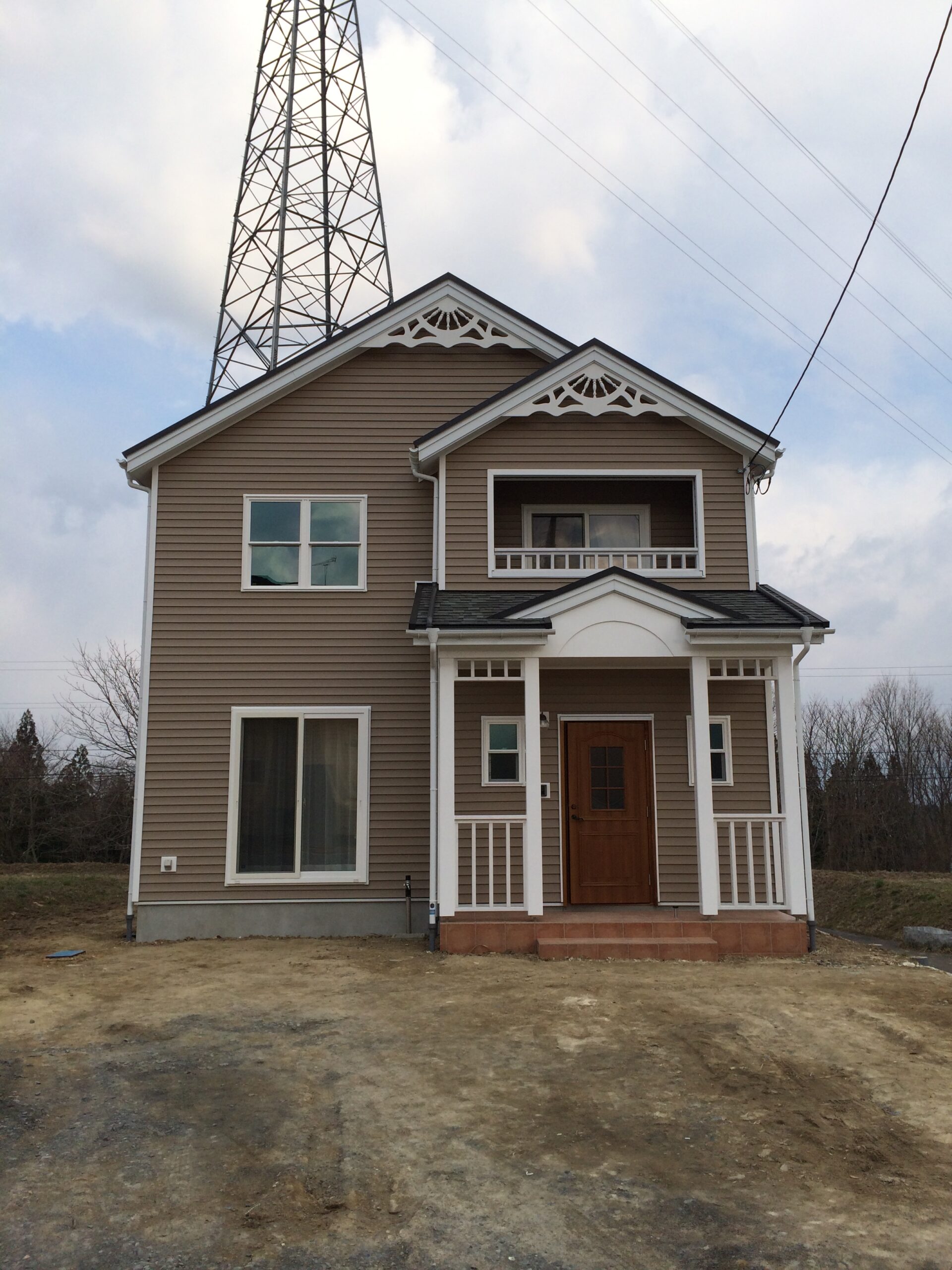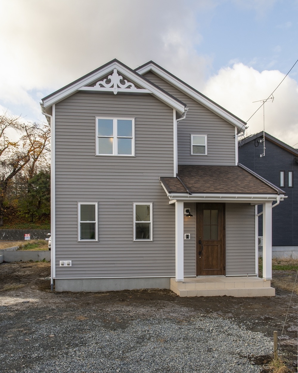 こちらのお家ではホワイトの妻飾りとポーチ柱、バルコニーの柵がアクセントになっています。