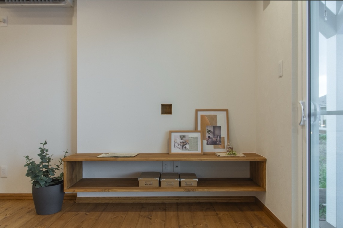 TV裏の壁を厚くして配線を落とします。TVボードを設けることで周辺機器を近くに配置出来ます。
