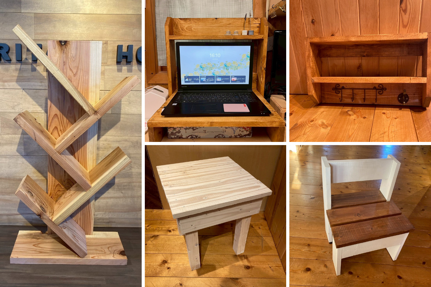 木工教室では、毎回新作を交えながら木工キットをご用意しています。昨年の作品キットは、斜めの本棚、PCラック、壁掛けシェルフ、スツール、ミニベンチでした!