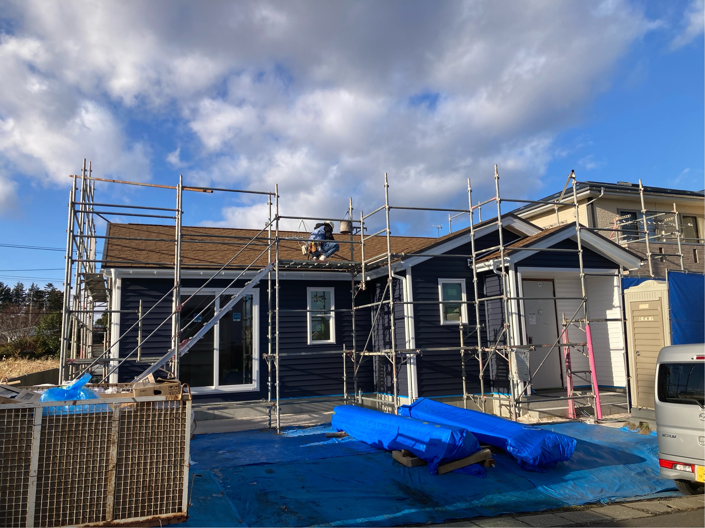 本日は、石膏ボード貼りおよび、アンテナ設置が行われております。