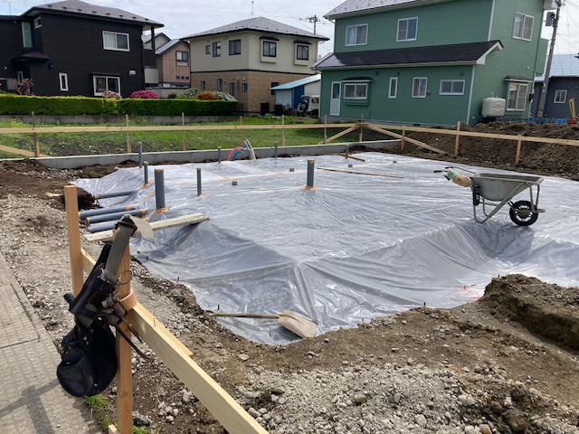 本日、捨てコンクリートを打設するために、防湿シートを敷いているところです。