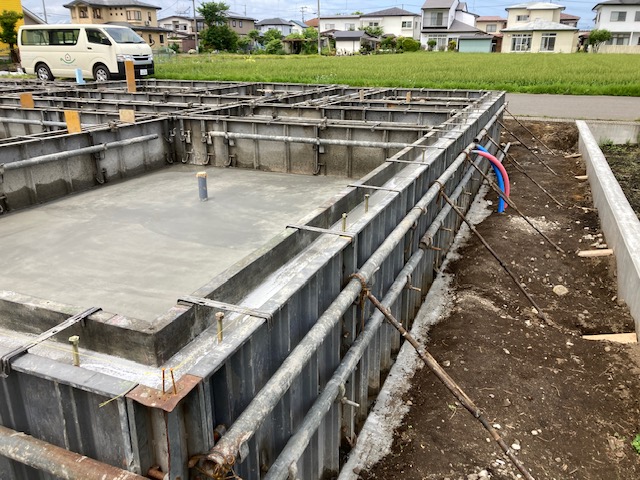 基礎工事に入り、根堀り作業が終わって設備業者さんが、配管を埋め終わったところです。