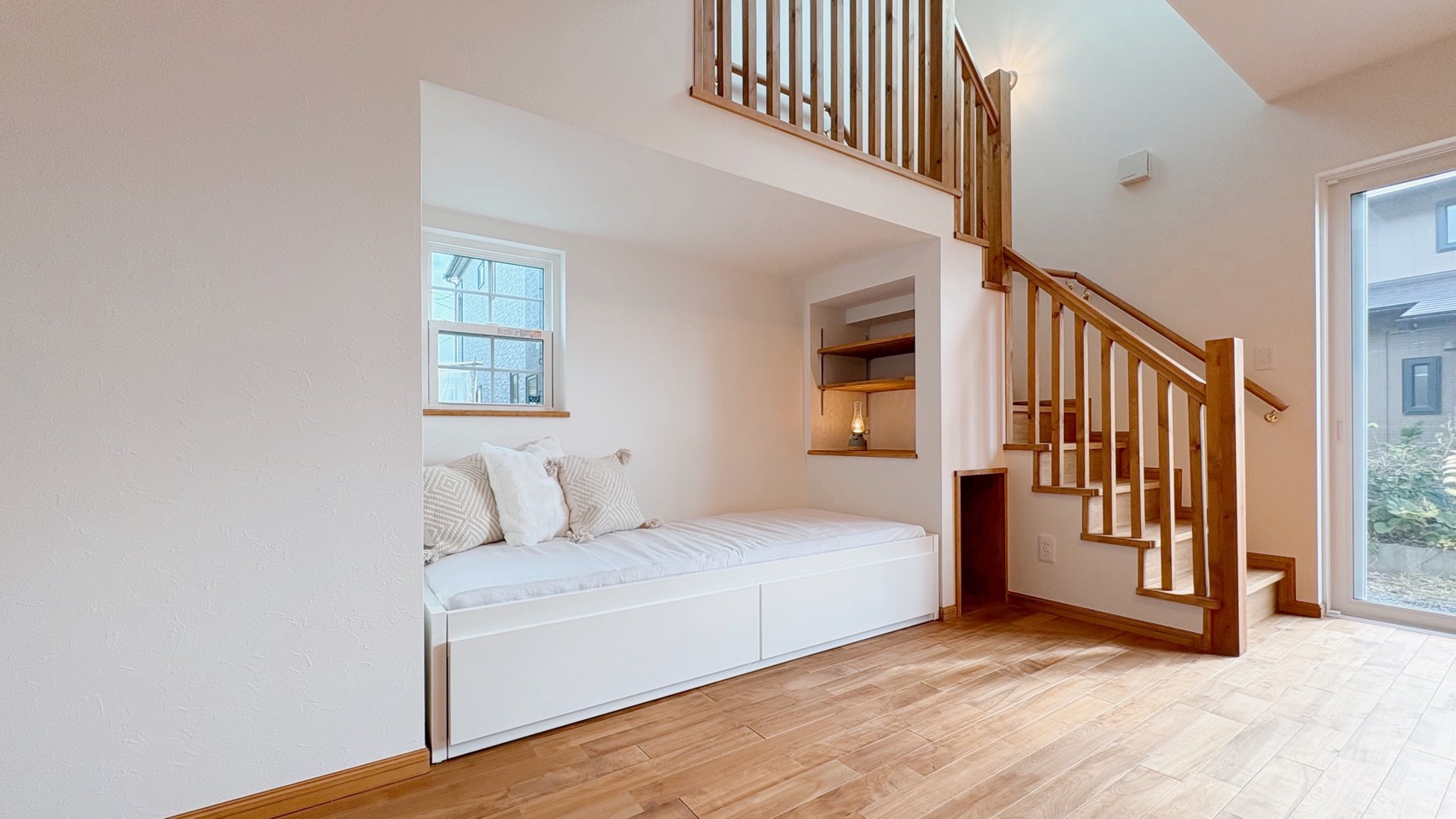 階段下を収納ではなく、ソファースペースとして活用したヌック風の空間です。ヌックとは、海外の住宅でよく見られる「小さな居心地の良い空間」のこと。リビングの一角に設けた、ちょっとした特別な居場所です。家族それぞれがくつろいだり、読書を楽しんだり、お子様が遊んだり。限られた空間を有効活用しながら、家族の多様な過ごし方を叶える設計です。「階段下ってこんな使い方もできるんだ!」という新しい発見をぜひ会場でご体感ください。
