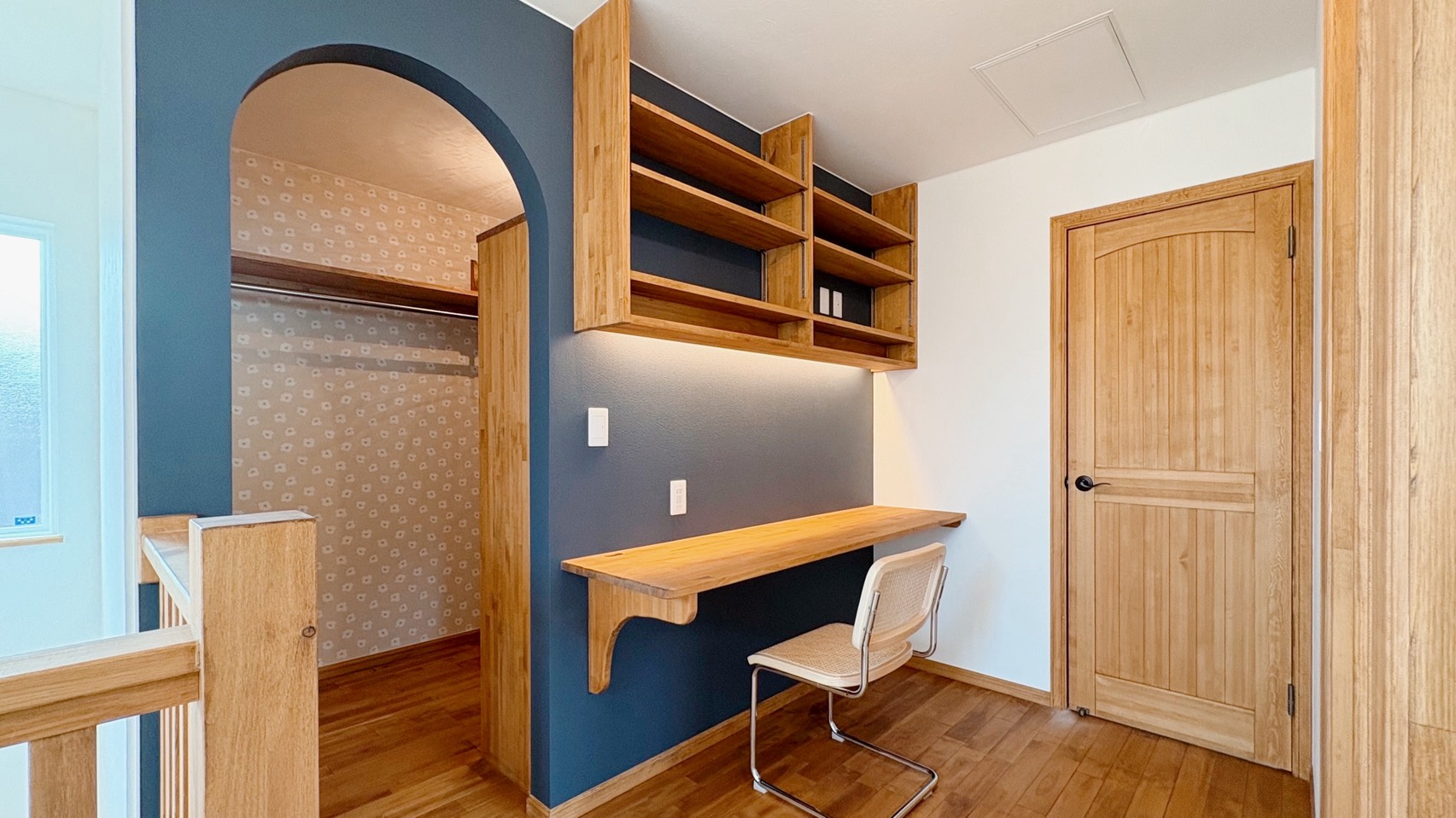 2階の廊下に造作したカウンターは、ゲームを楽しむご主人の趣味空間。使いやすい奥行きと高さを考慮して設計したカウンターは、モニターや周辺機器も使いやすく配置できます。廊下という限られたスペースを有効活用することで、個室を設けることなくご主人専用の居場所を確保。家族それぞれの「好き」を大切にしながら、空間を効率的に使う工夫が詰まった設計です。