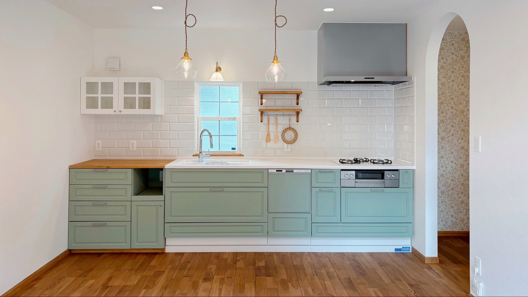 【八戸市日計】LDKにゆとりを感じる壁付けキッチン。セージグリーンの扉で魅せる海外スタイルキッチンの家