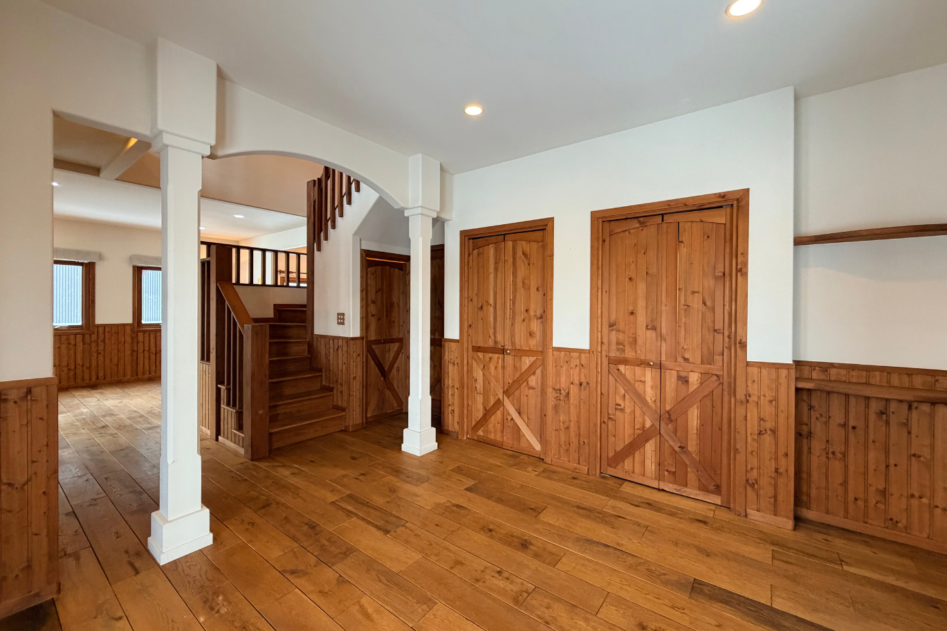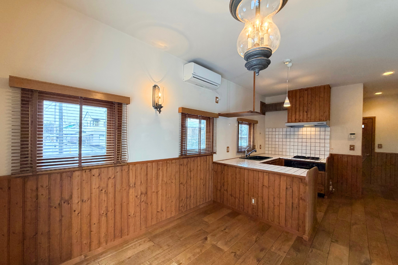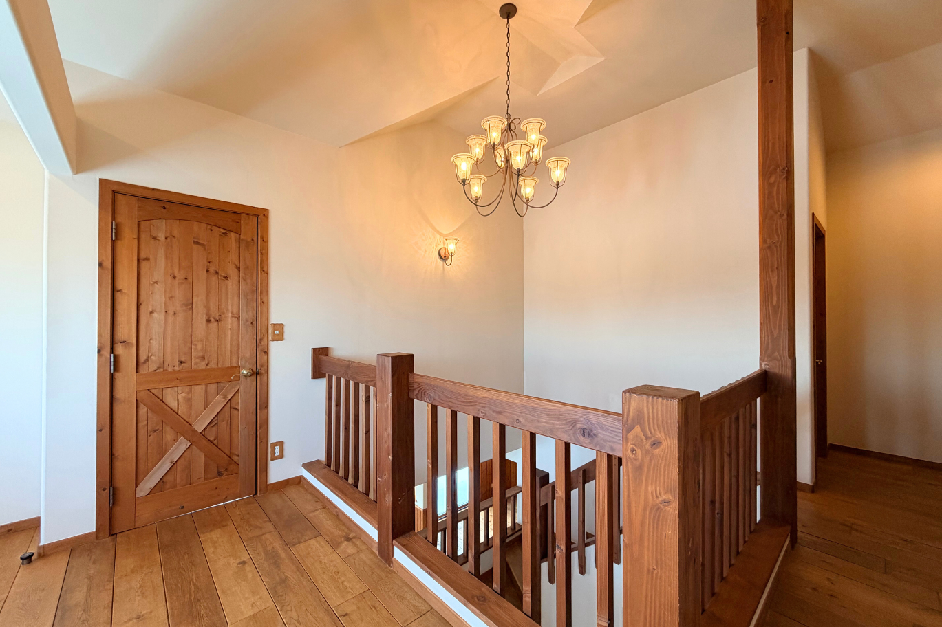 大工さん手作りの階段手摺とシャンデリアでアメリカンヴィンテージを感じられるインテリアです。