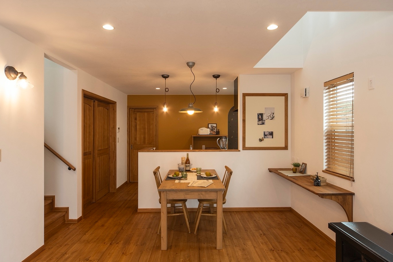 奥様お気に入りのマスタードカラーの壁紙をキッチン背面のアクセントに。 キッチンに隣接させたパントリーは壁いっぱいに収納でき、リビングから見えない位置で生活感もスッキリ!