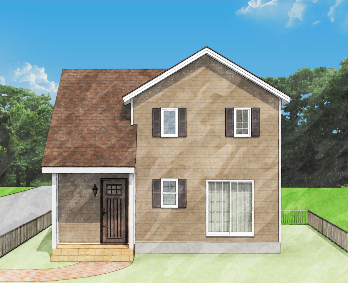 グレージュの外壁に白い窓枠が映え、ブラウンの大屋根が全体をやさしく包み込む上品なアメリカンデザインは、かわいさと落ち着いた雰囲気がちょうどよく調和した外観です。